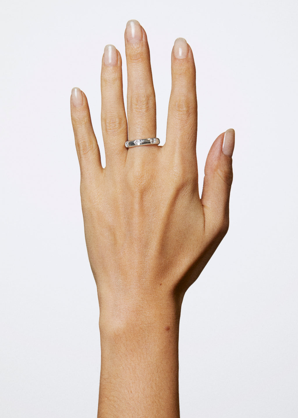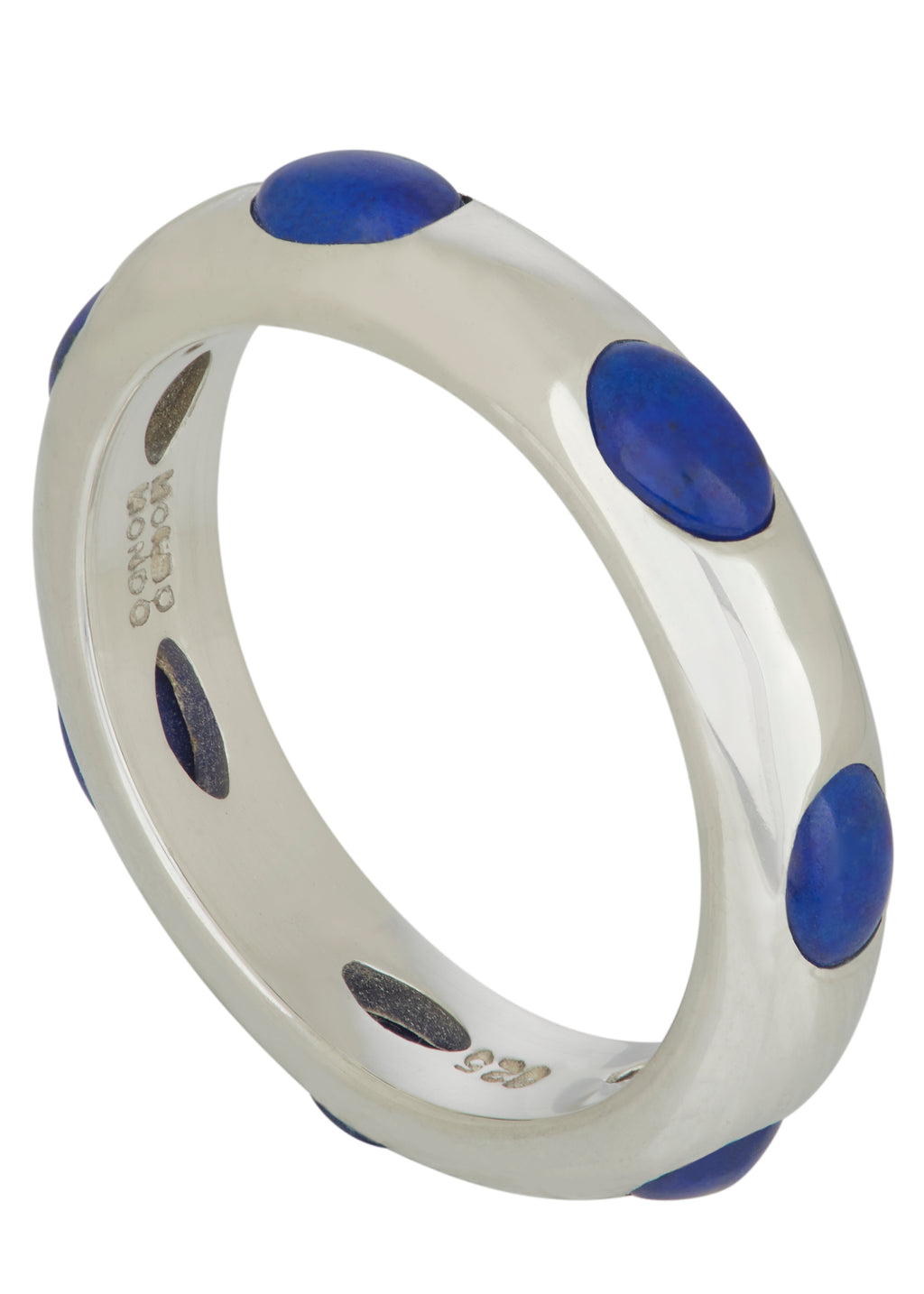 Sterling silver eternity band set with 3x5mm oval lapis cabochons. This style cannot be resized due to the unique design of this ring.
