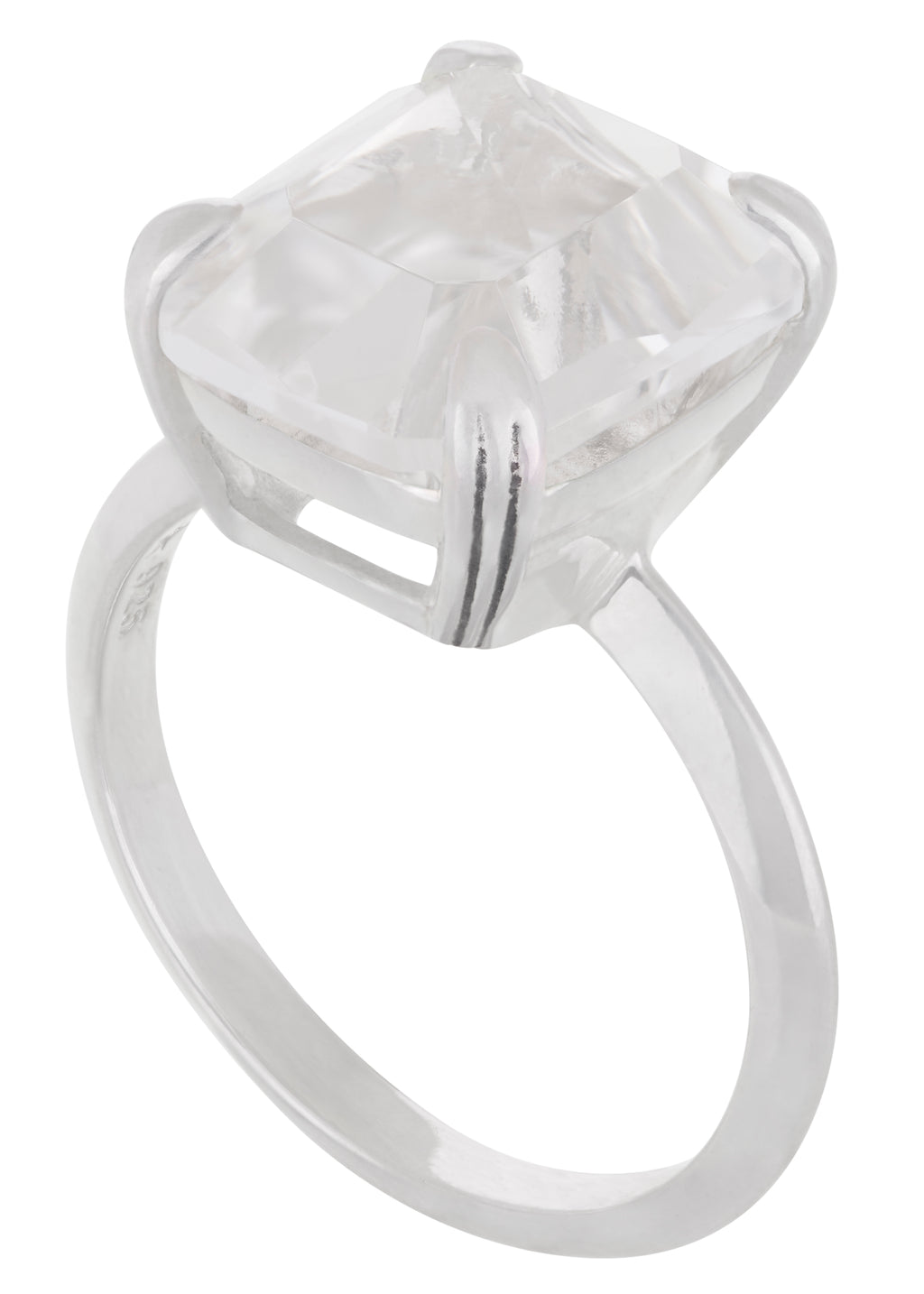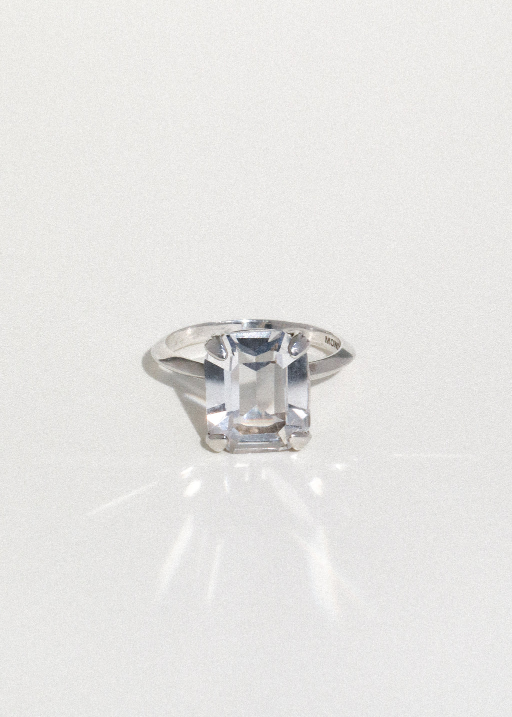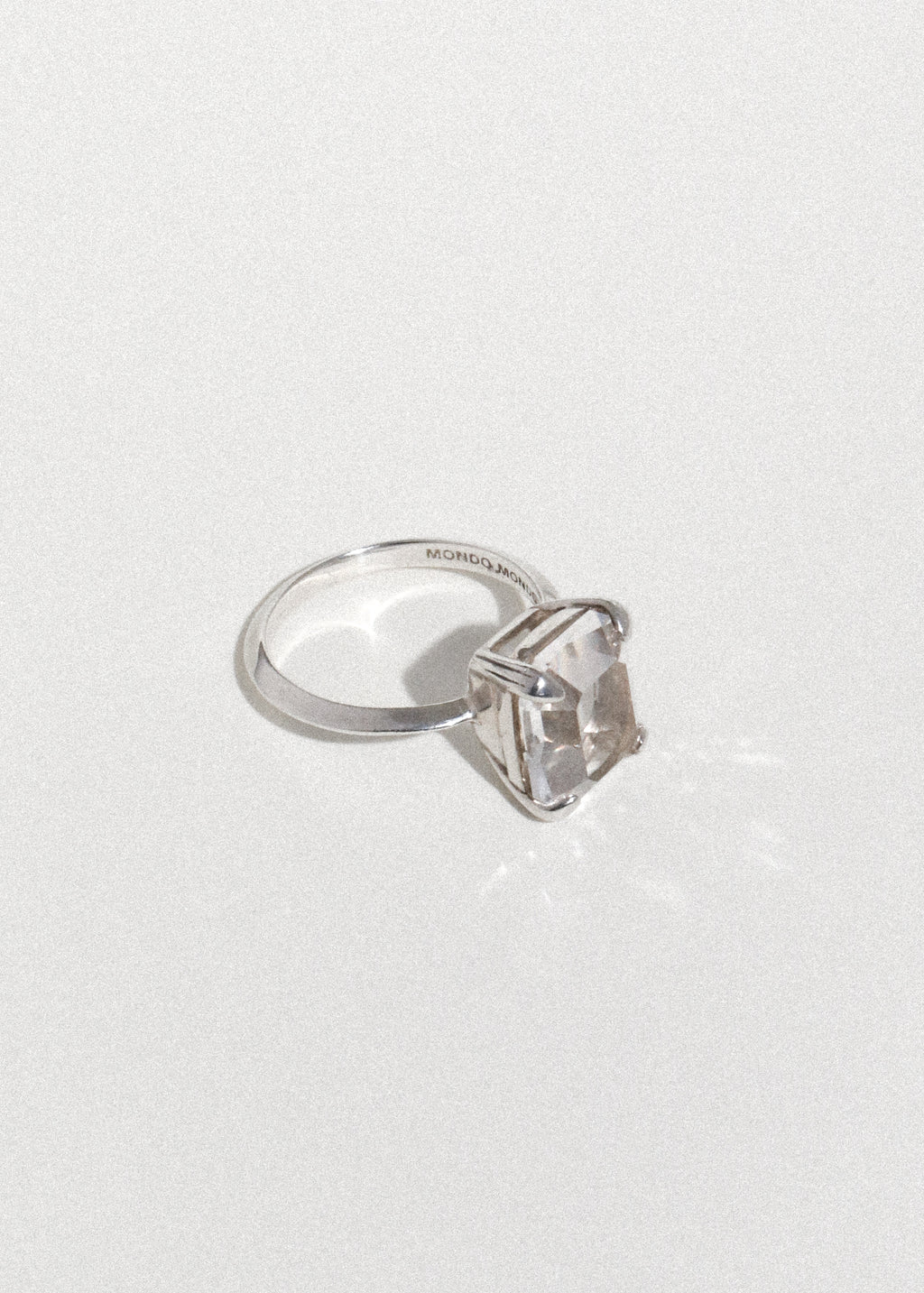 Tada it's Teddy. Inspired by deco geometry and clarity. Sterling silver ring with custom hand-cut glass stone with etched prong setting and knife edge band. Stone measures 12x10mm.