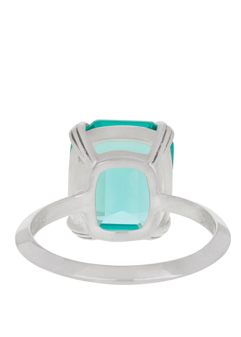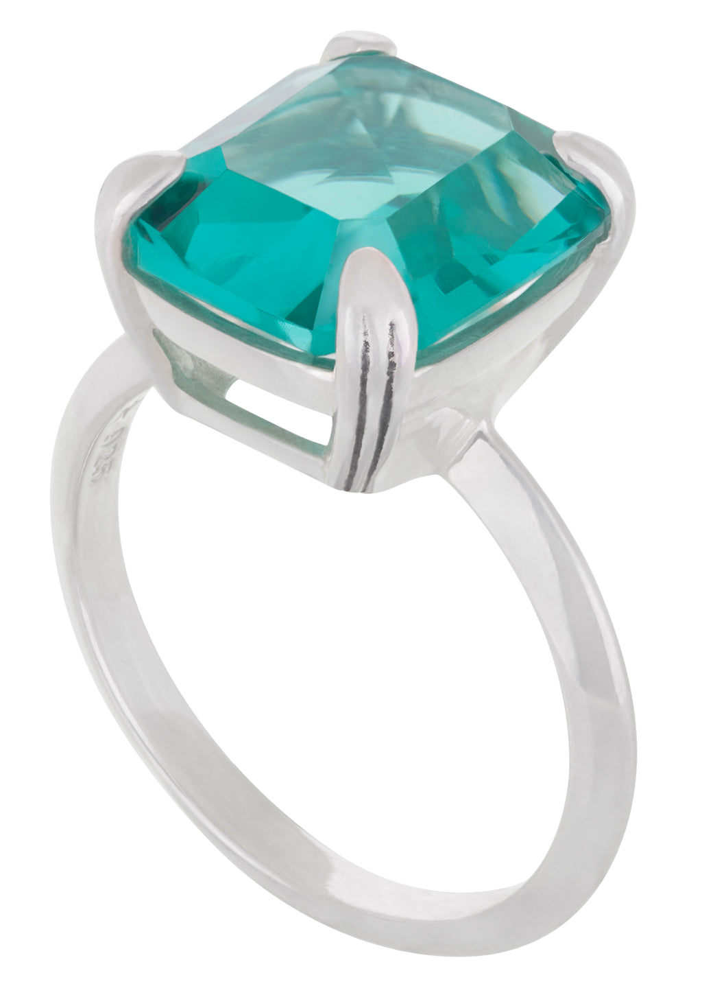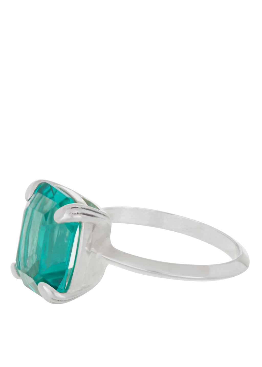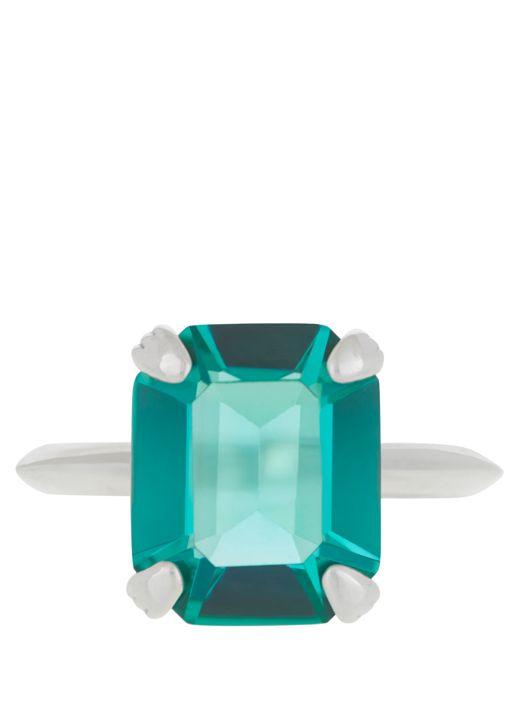 Tada it's Teddy. Inspired by deco geometry and clarity. Sterling silver ring with custom hand-cut glass stone with etched prong setting and knife edge band. Stone measures 12x10mm.
