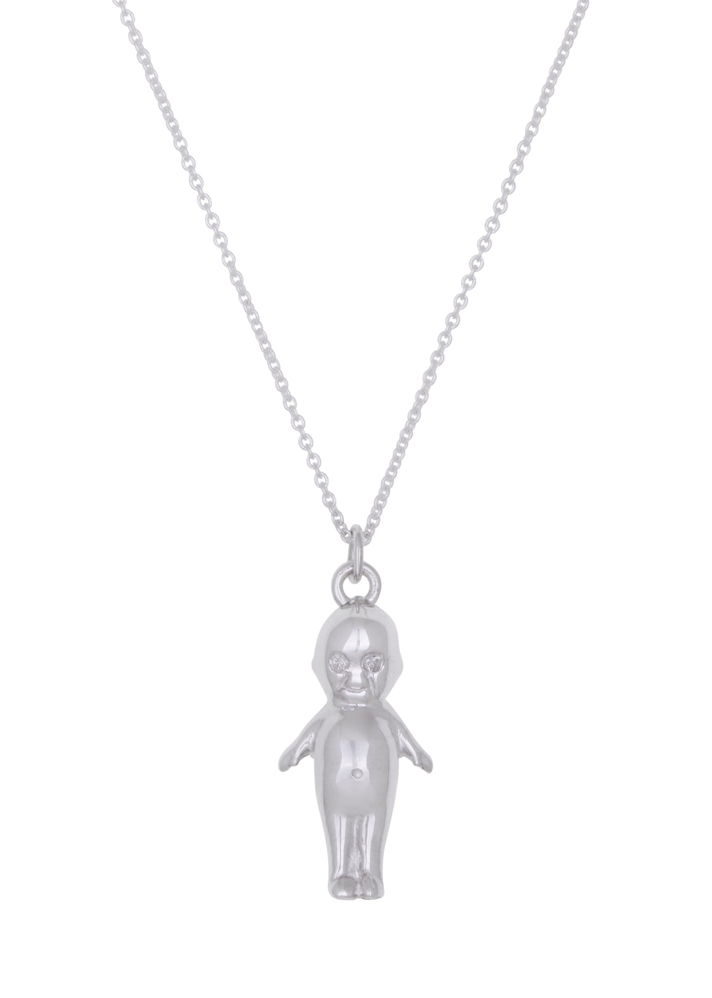 Sterling silver baby pendant on silver cable chain with diamond set eyes.
