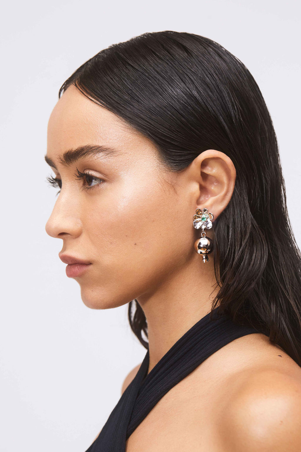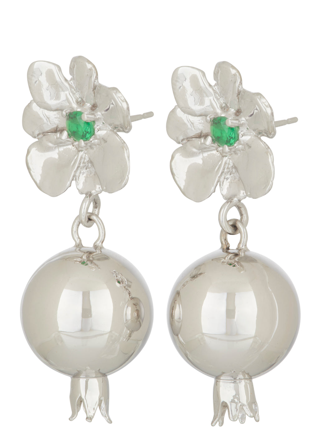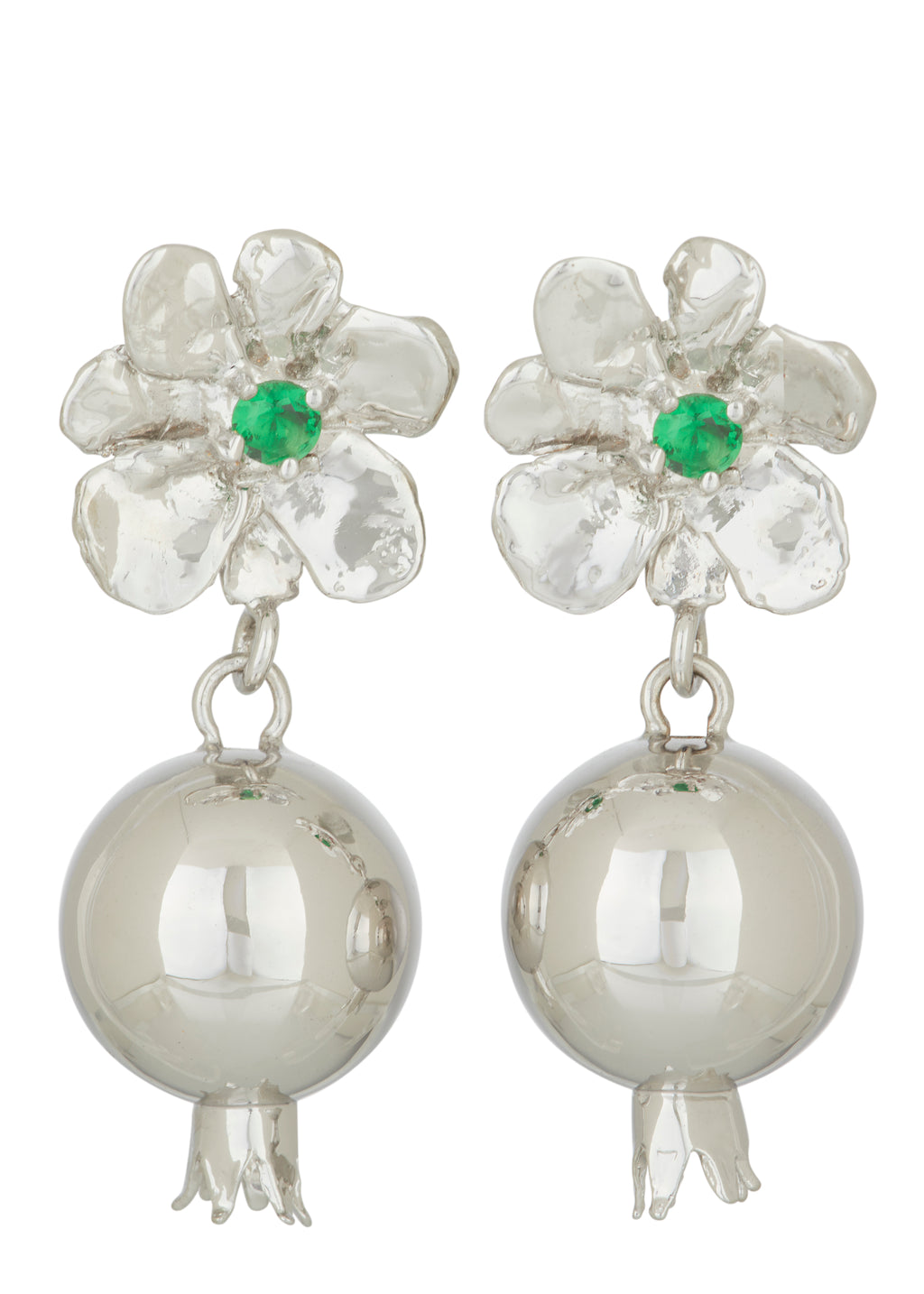 Pair of white bronze-plated earrings with flower, set glass stones, and hollow pomegranate drop.
