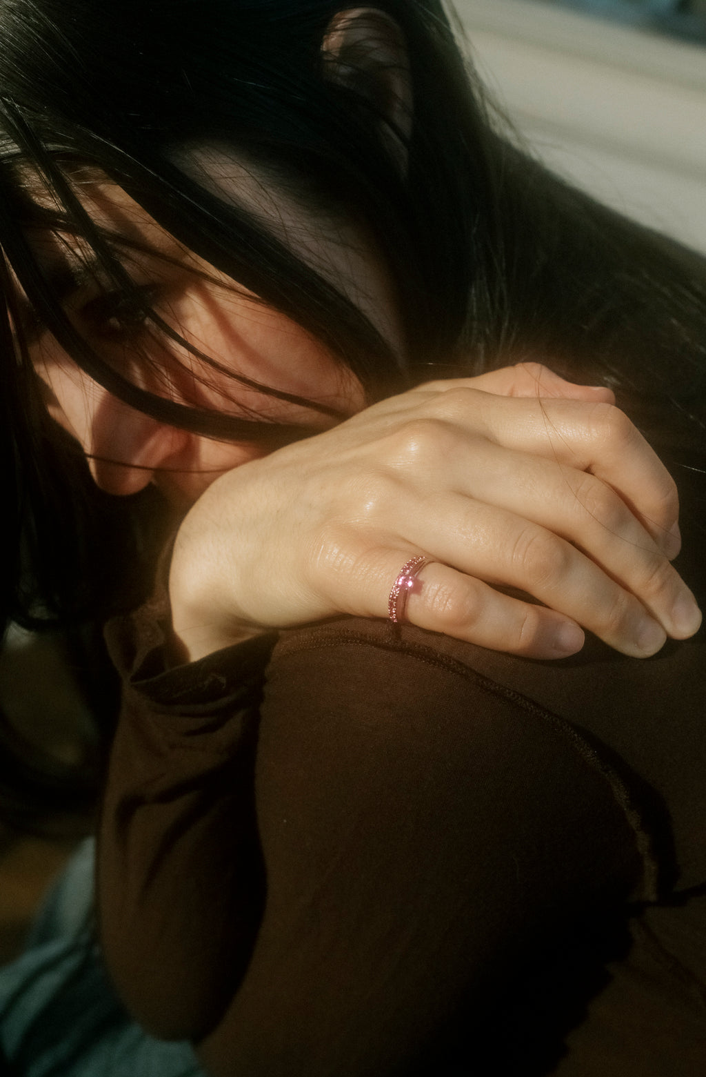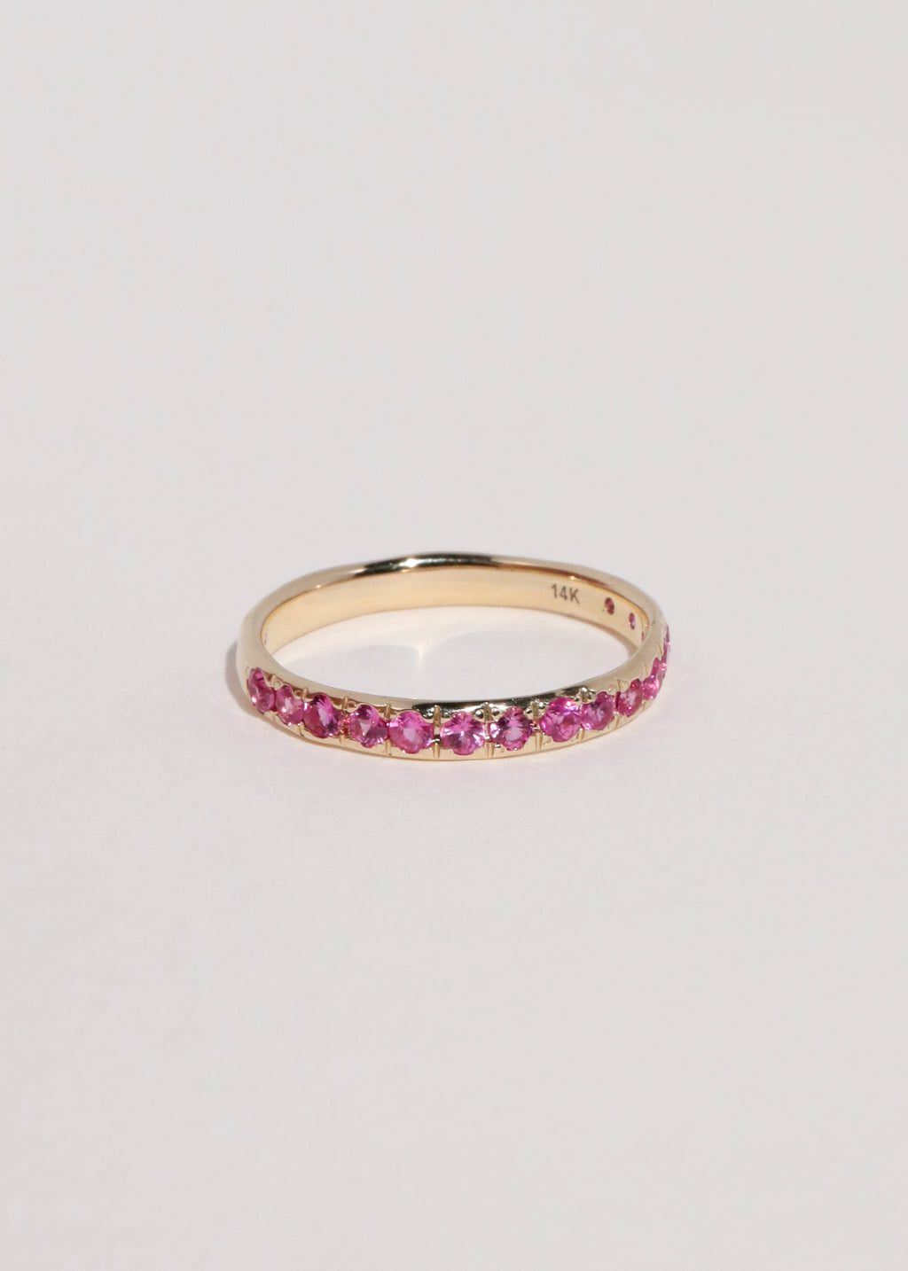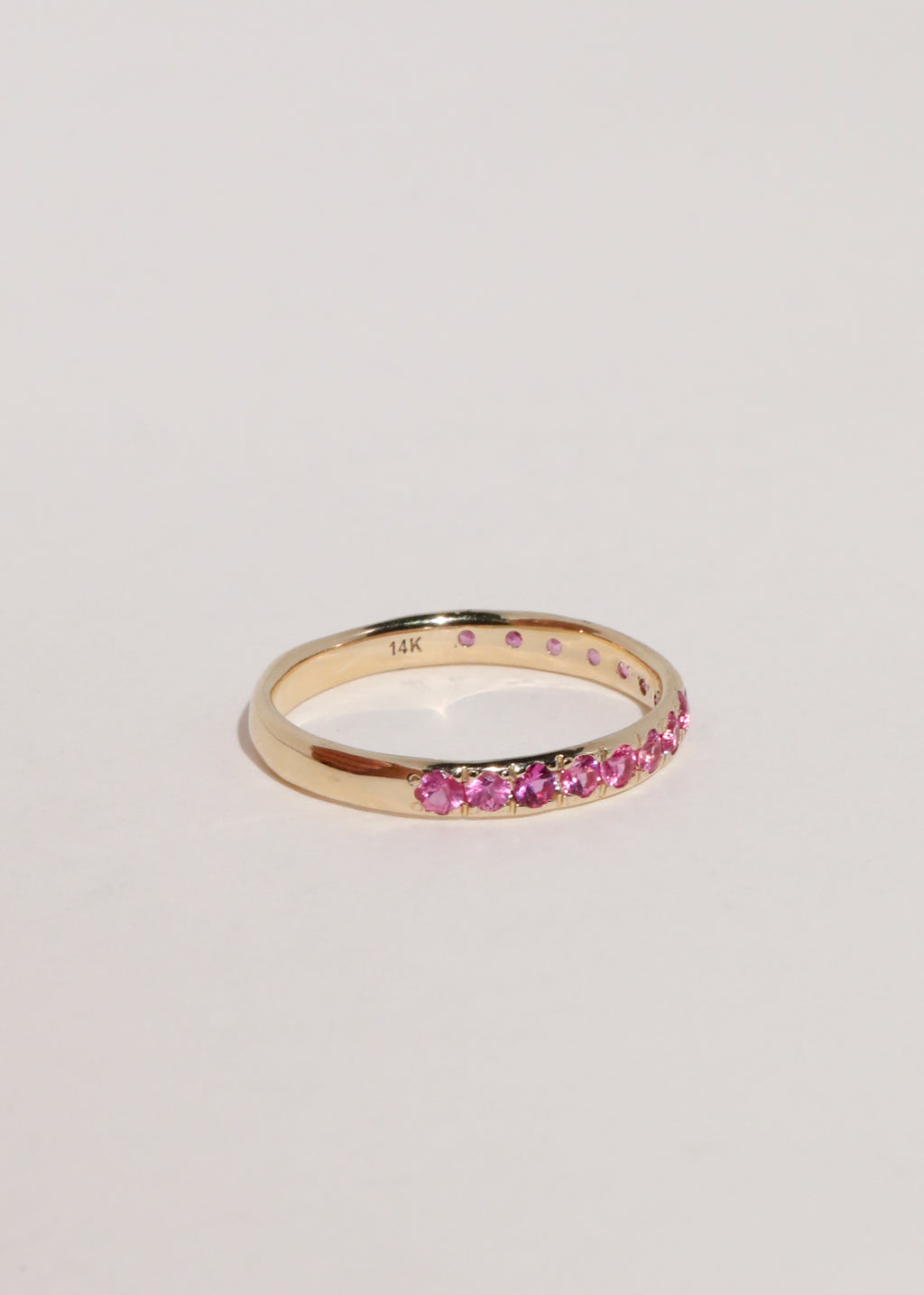 A 3mm textured band with 2mm pave set pink sapphires in 14k yellow gold. This style cannot be resized due to the unique design of this ring.