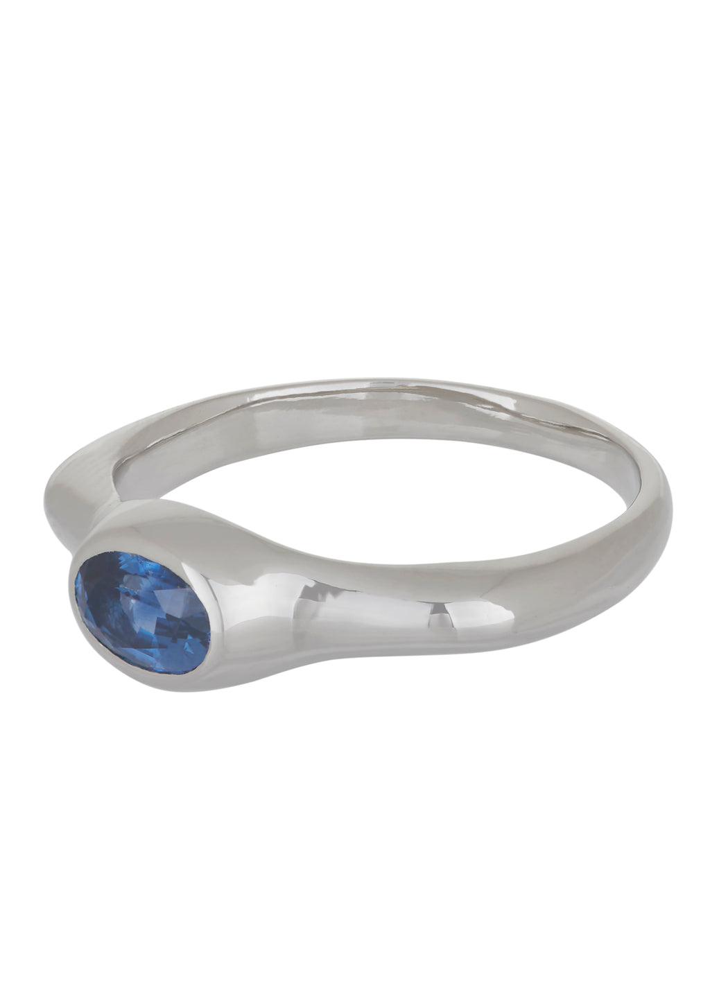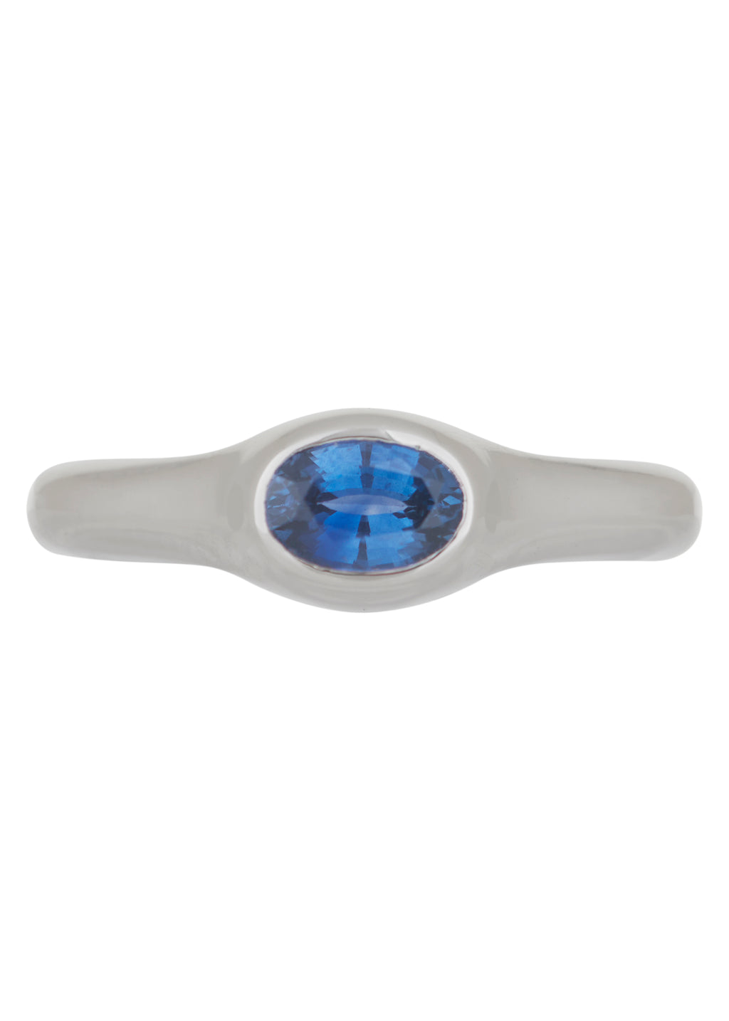 14k white gold ring set with a 4x6mm oval faceted blue sapphire.