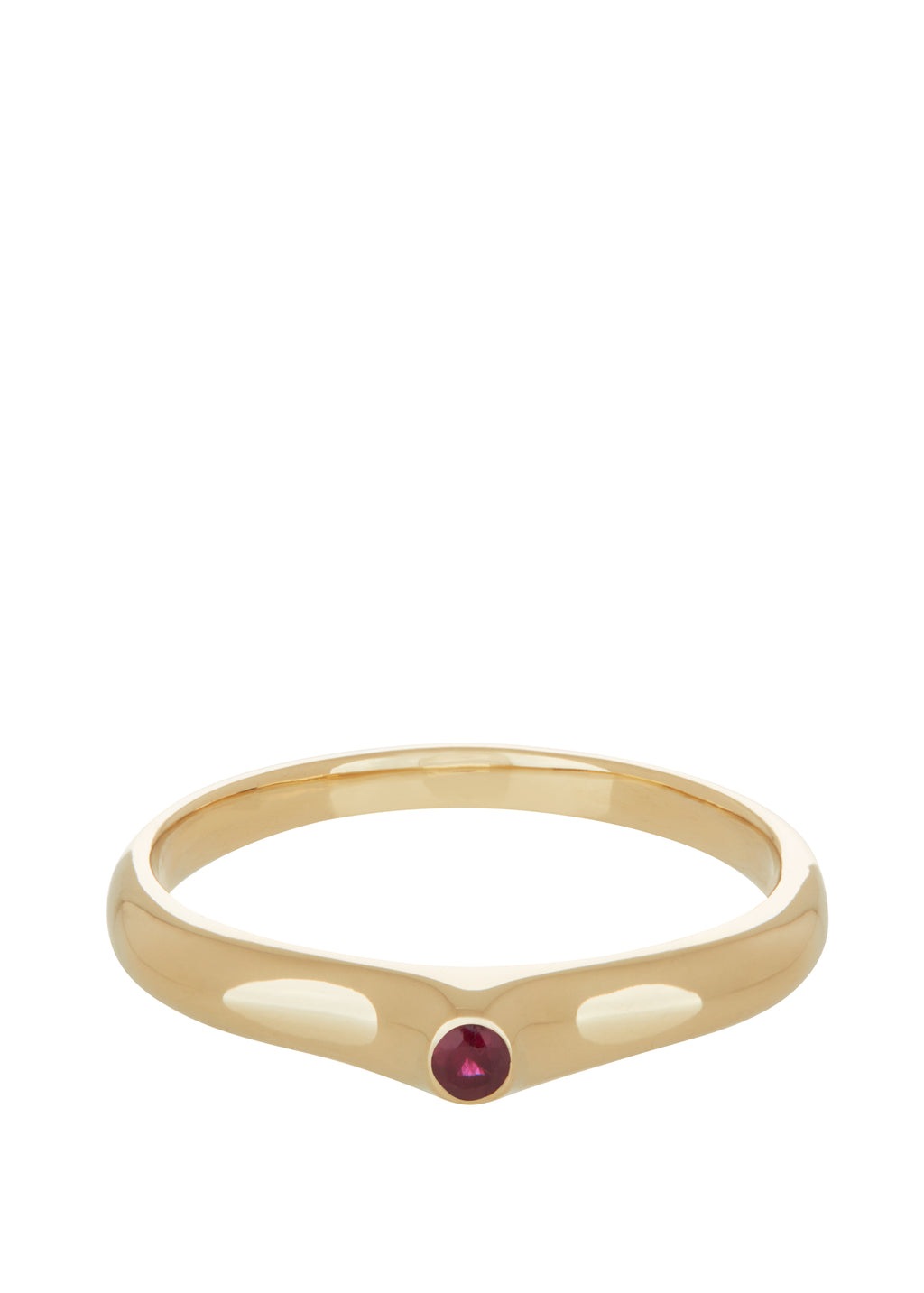 14k yellow gold ring set with a 2mm round faceted ruby.