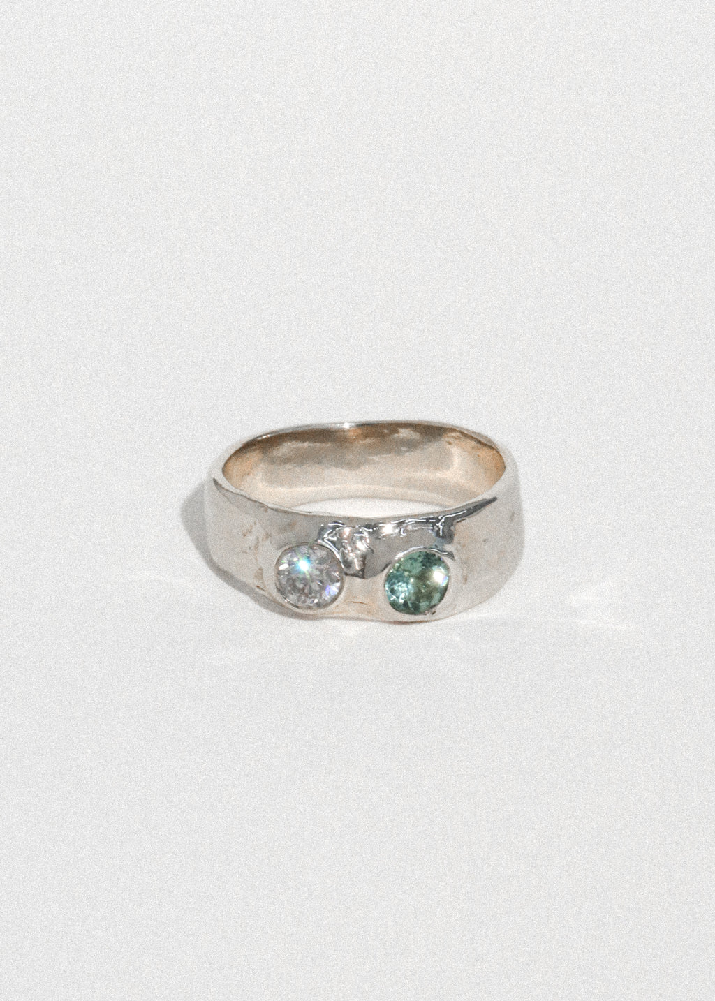 A Mondo classic in 14k white gold set with a 3.5mm diamond and a mint green tourmaline.
