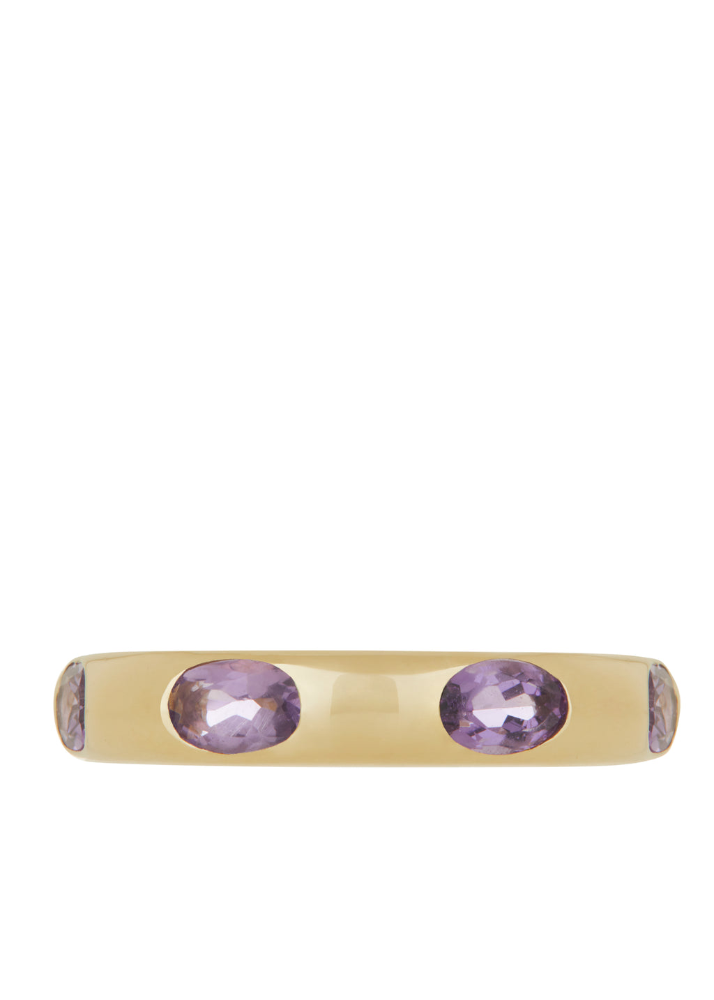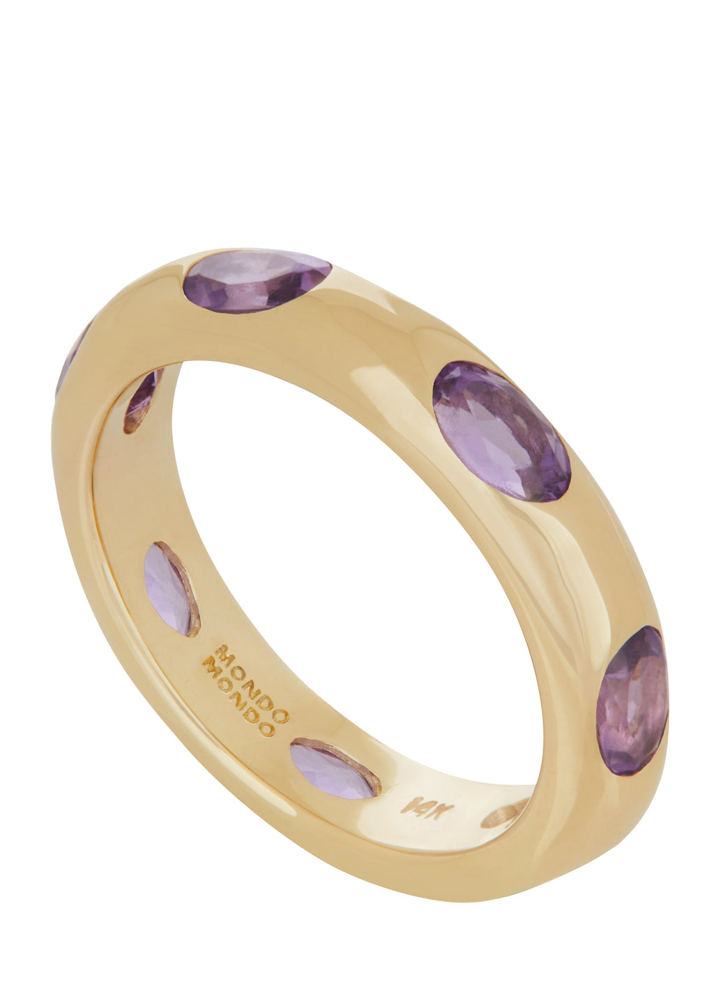 14k yellow gold eternity band set with a 3x5mm oval faceted light amethyst. This style cannot be resized due to the unique design of this ring.
