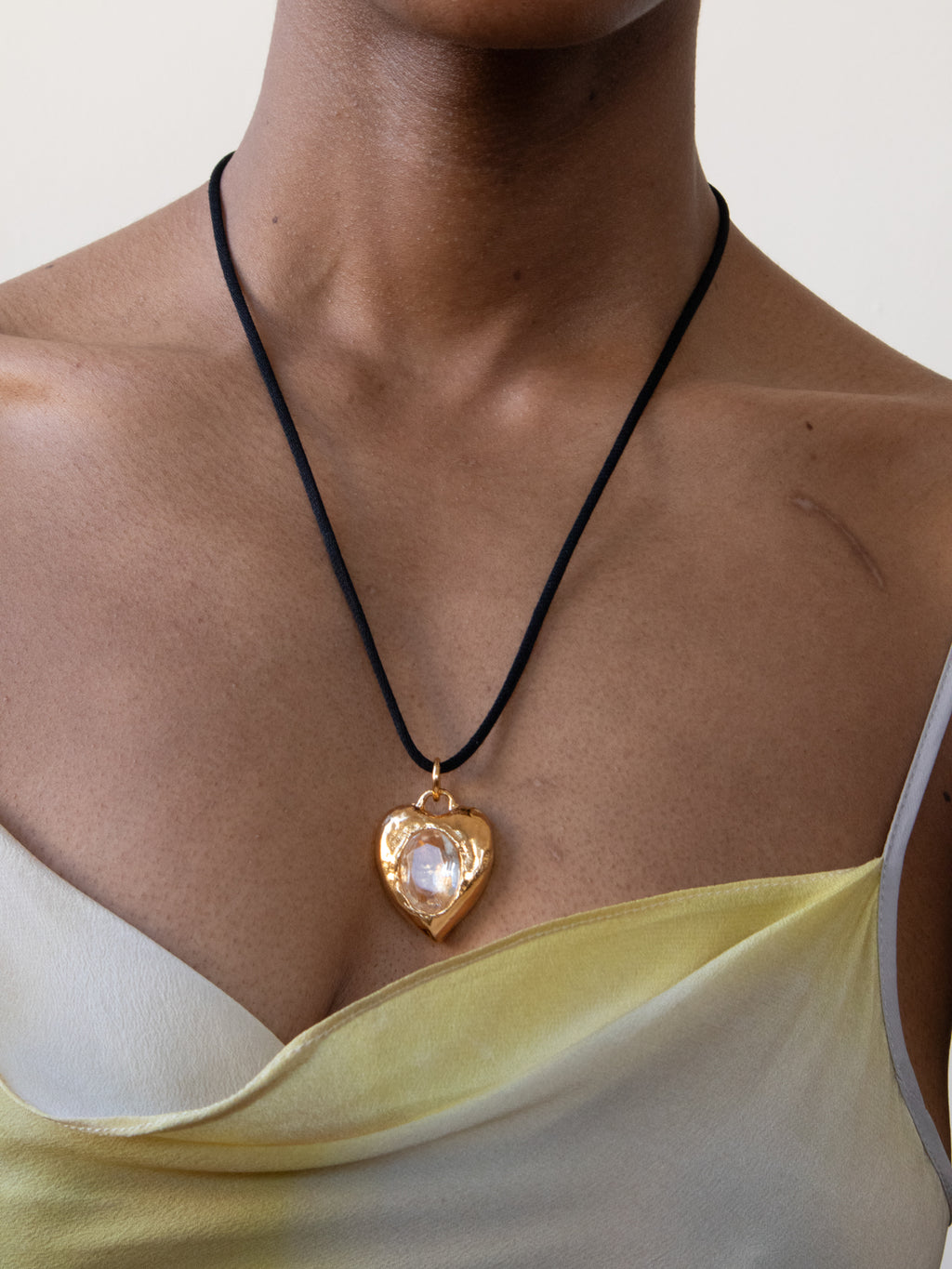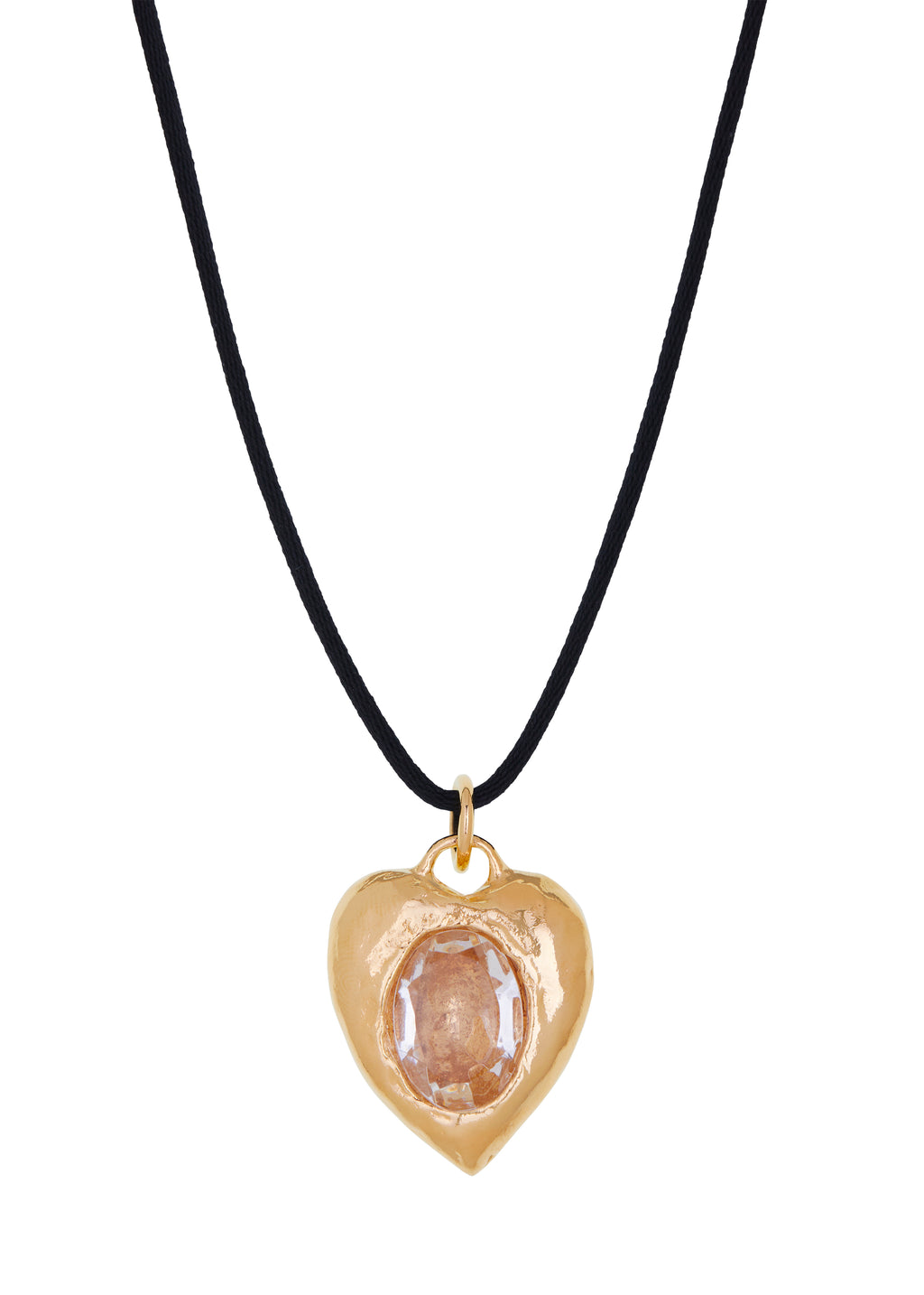 18k gold plated heart necklace set with 18x13mm clear glass stone on black satin cotton cord. Charm Length:1.25" Cord length: 40"