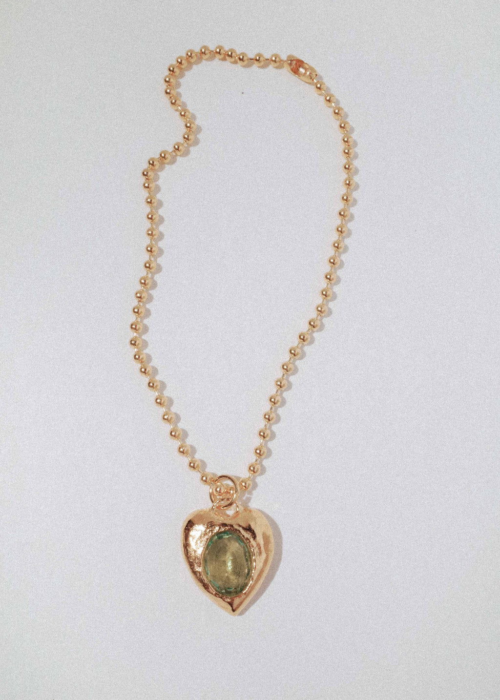 18k gold plated heart necklace set with 18x13mm glass stone on ball chain.