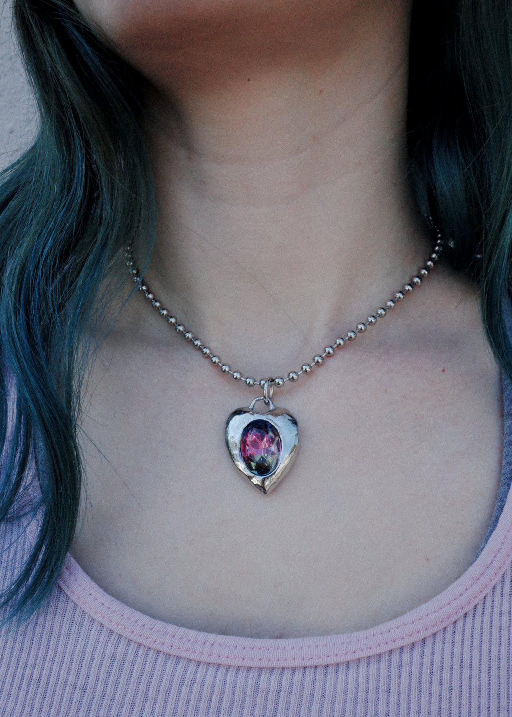 Silver-tone heart necklace set with 18x13mm glass stone on ball chain.