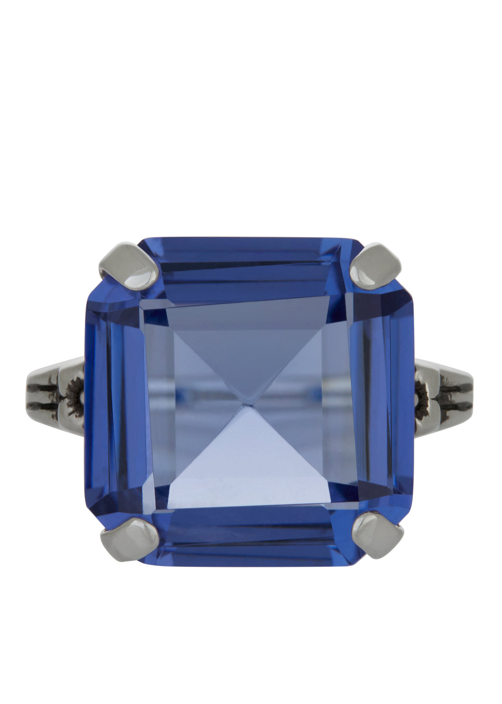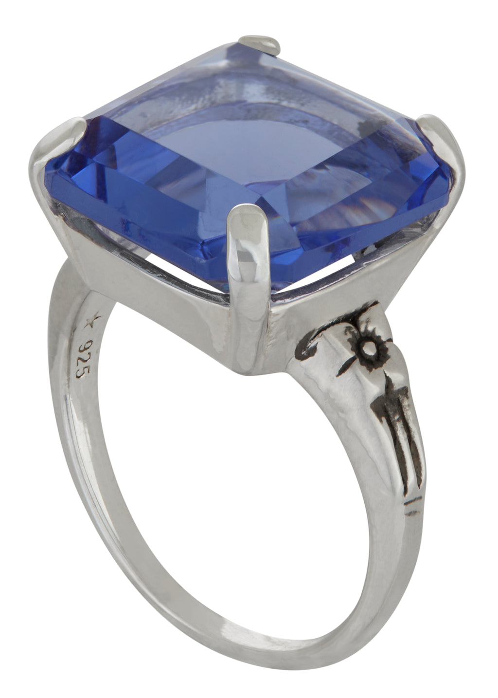 Lovely Leroy. Sterling silver ring with custom hand-cut square glass stone with ornate floral band details. Stone measures 14x14mm.