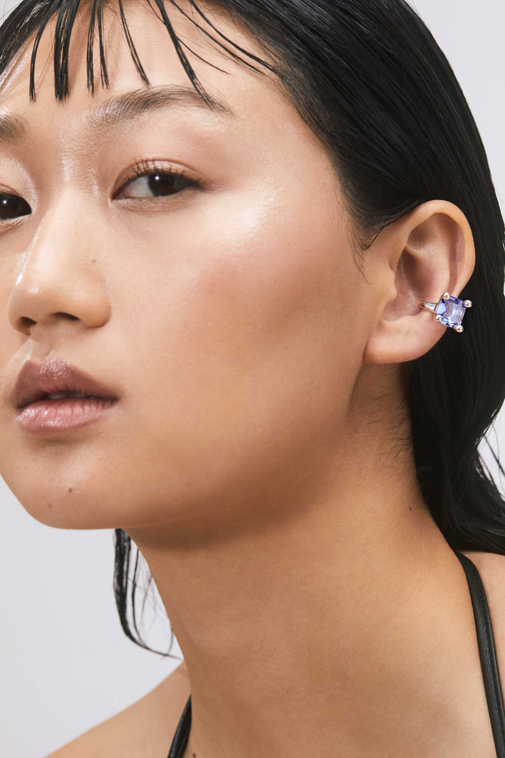 Sterling silver ear cuff with custom, hand-cut 10*10mm glass stone in ball prong setting with star cutout.