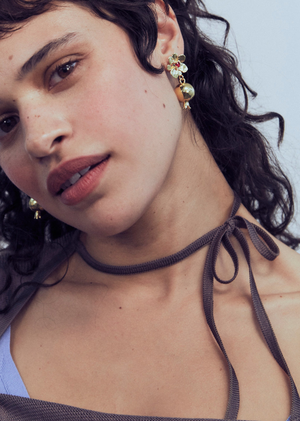 Pair of 18k gold plated earrings with flower, set glass stones, and hollow pomegranate drop.