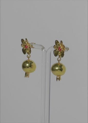 Pair of 18k gold plated earrings with flower, set glass stones, and hollow pomegranate drop.