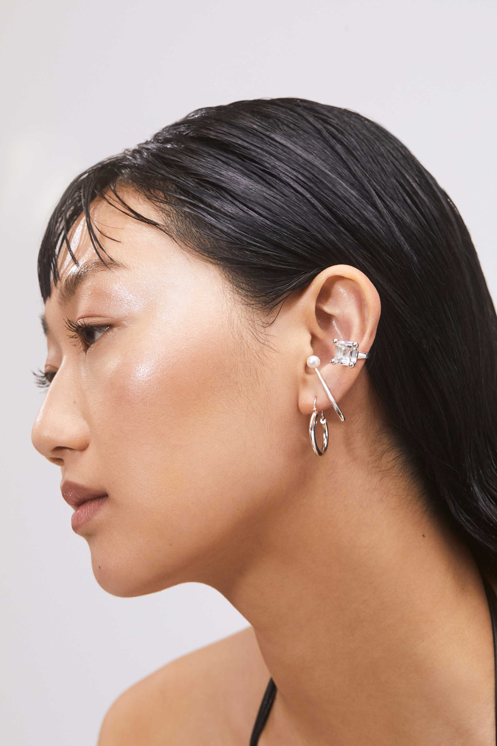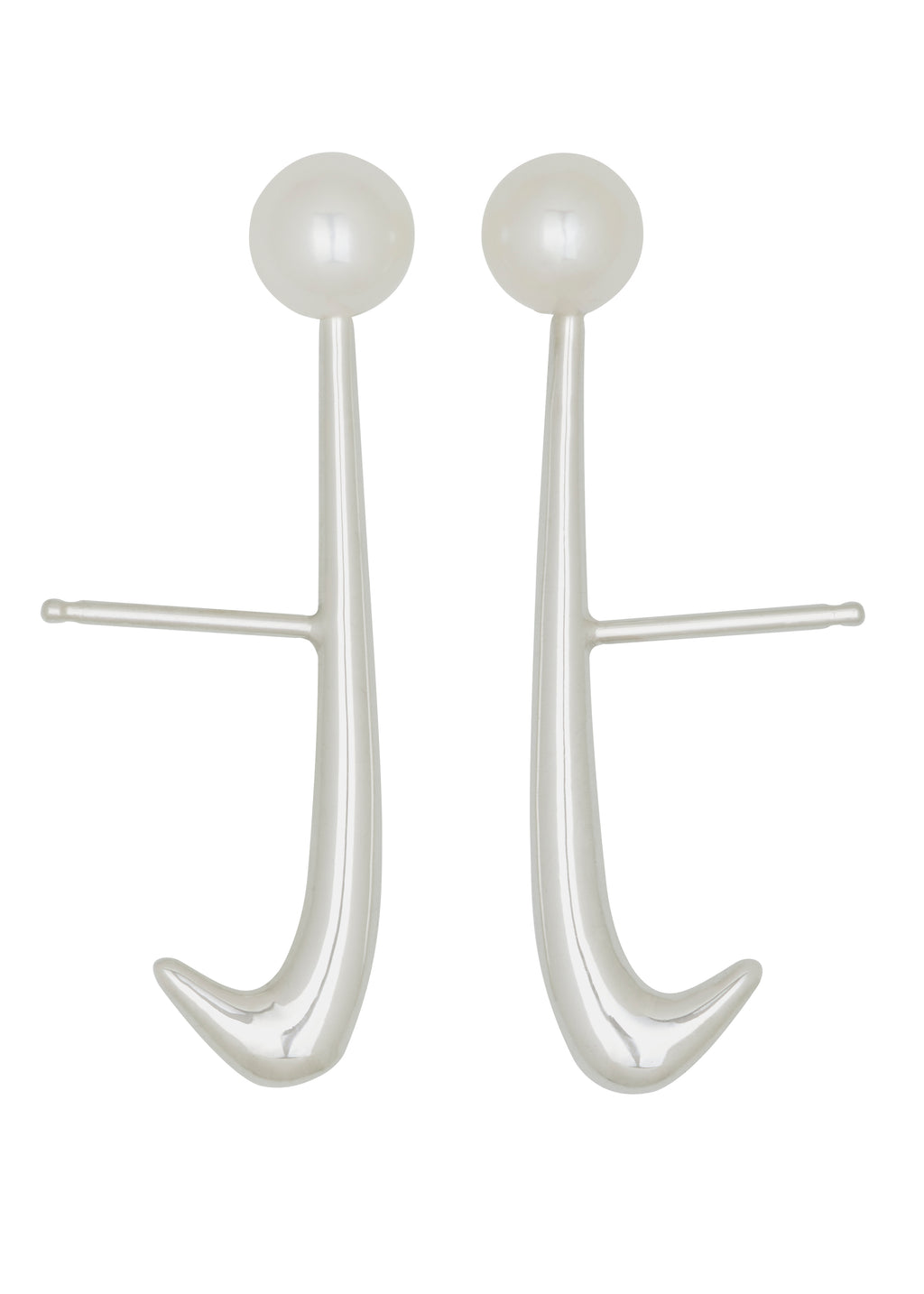 Sterling silver boomerang-shaped earring topped with a pearl.