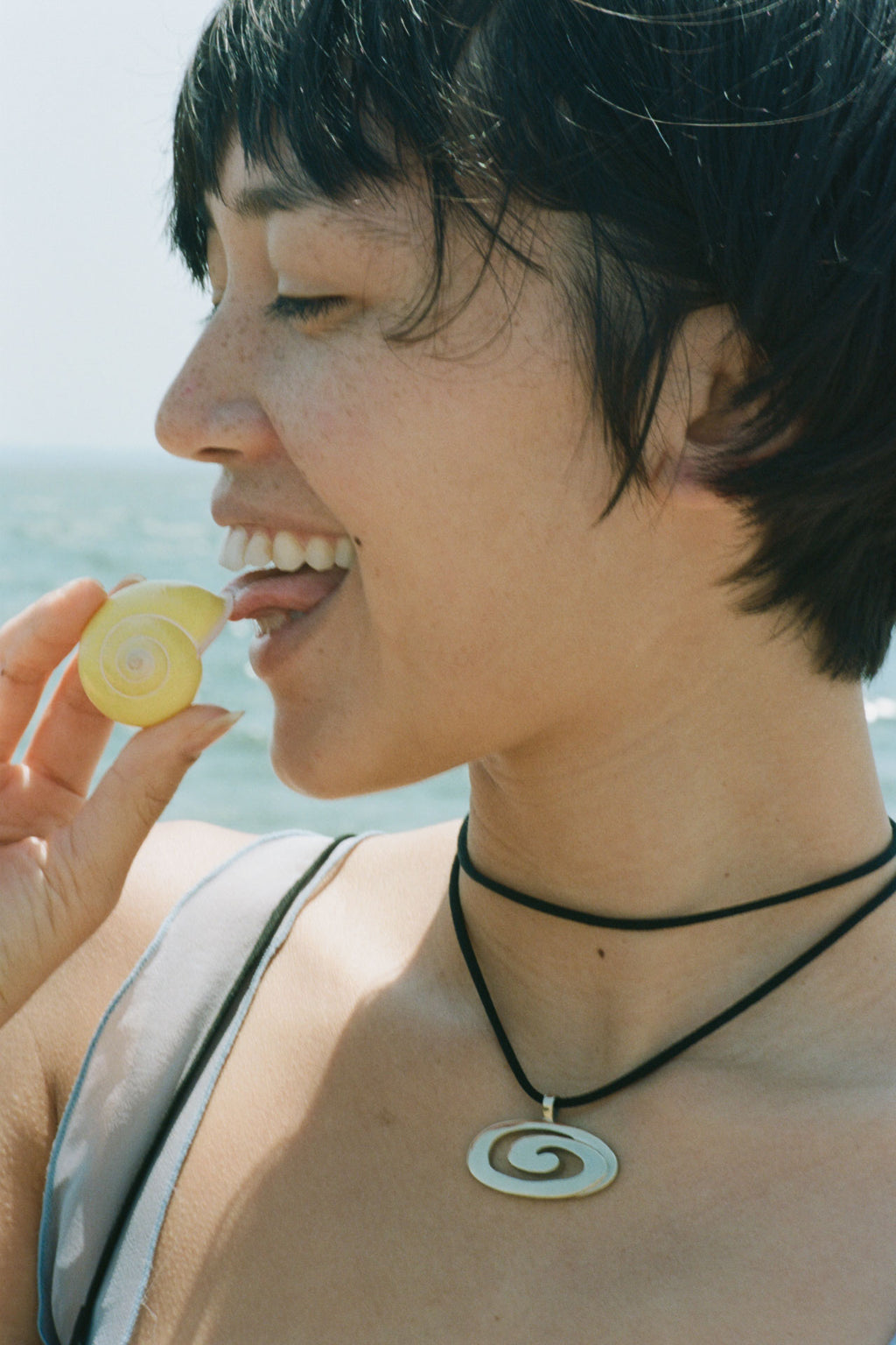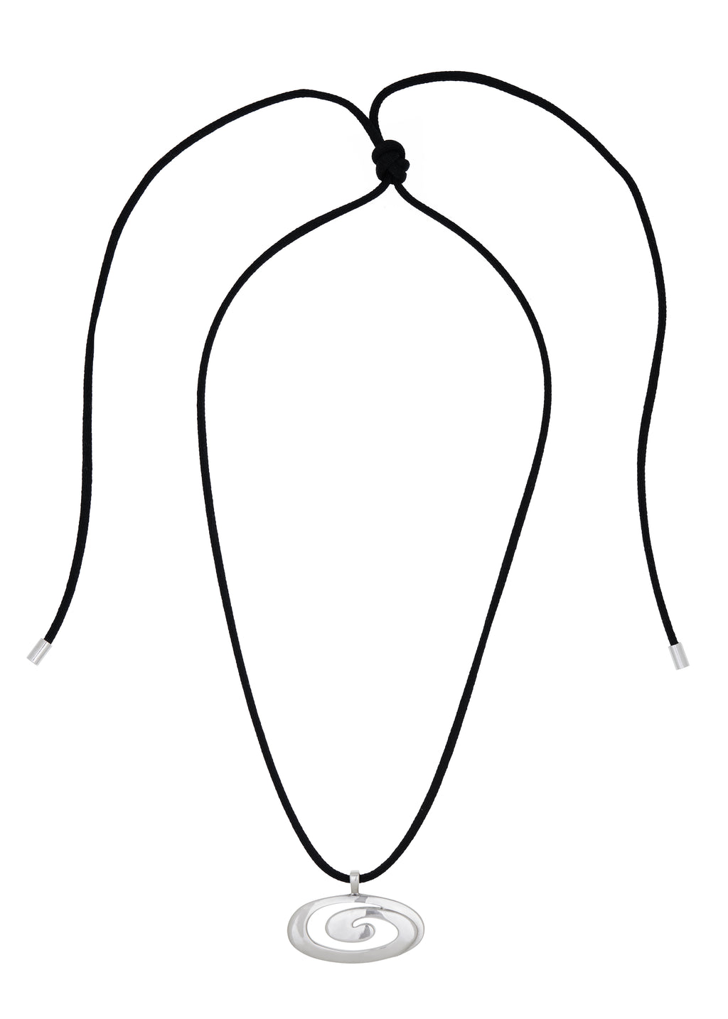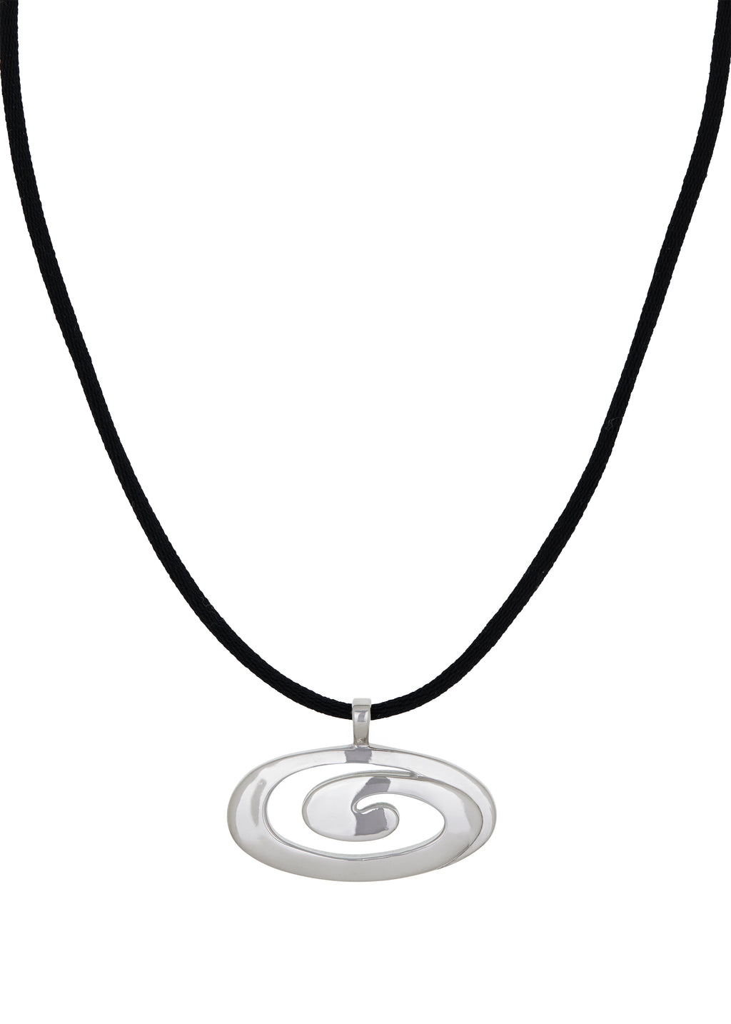 Adjustable black satin cotton cord with white bronze pendant. Designed to be worn double or single wrapped.