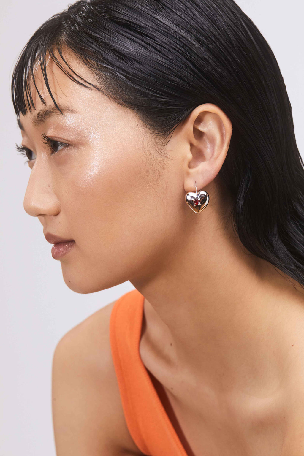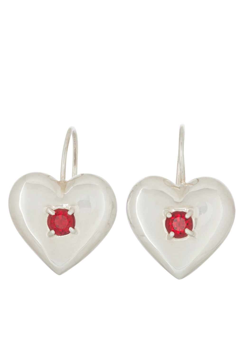 Pair of heart-shaped drop earrings set in the center with a ruby red glass stone.