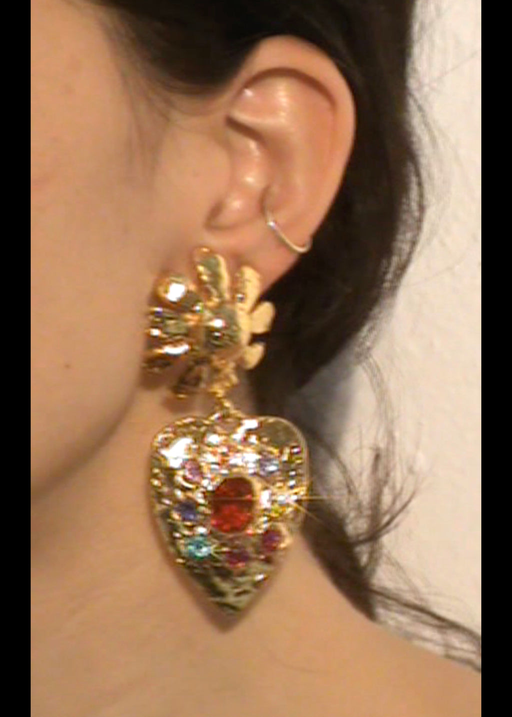 Pair of 18k gold plated clip-on drop earrings with flower and heart drop with 10x8mm red glass cut stone and 4mm crystals.